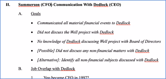 First, it forces you to think concretely and realistically about what you are trying to do in a particular part of the deposition. In reviewing evidence to prepare for the example deposition above, you may have come across a number of interesting communications between the witness and her CEO. But the exercise of forcing yourself to write out goals will make you think specifically about what testimony, given those communications, you can get that will advance your case. It also gives you an opportunity to think about how likely you are to get that testimony. For example, you might consider whether the goals above should include trying to elicit an admission that “the Well project was not a material financial event,” i.e., the ultimate issue in your case. You might also reach the conclusion that the witness is unlikely to go that far, and that it isn’t necessary if you meet your first two goals. Or you might decide to include that as one of your “possible” goals, but not a “likely.” Whichever answer you come to, the exercise of thinking this through is excellent preparation.